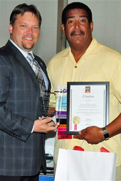 Councilman Stewart Cumbo receiving Maryland Municipal League (MML) 2014 President's Citation, for Dedicated Service, as the Chairman of the MML Convention, Ocean City Maryland. Presenting the Citation is the Mayor of Del Mar and President of the Maryland Municipal League, Carl Anderton, Jr.