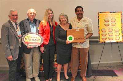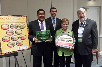 Councilman Stewart Cumbo receiving Award on behalf of the Town of Chesapeake Beach as a Sustainable Maryland Certified Community, accompanied by Connie O'Dell, Town Director of Economic Development, Mayor Bruce Wahl, and University of Maryland Sustainable Maryland Program Director Mike Hunninghake. Photo was taken at the Lowes Hotel, Annapolis, Maryland, during the Maryland Municipal League 2014 Legislative Conference.