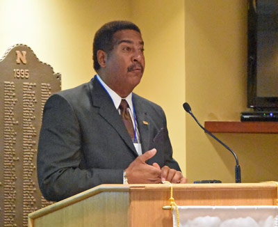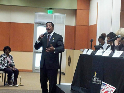 Councilman Stewart Cumbo, 3rd Vice President of the Calvert County Branch of the NAACP, at a NAACP Town Hall Community Forum, College of Southern Maryland, addressing an audience on Citizen Law Enforcement Concerns in Calvert County.