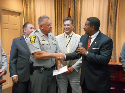 Councilman Stewart Cumbo who serves on the Board of Trustees of the Local Government Insurance Trust (LGIT) and serves as the Chairman of their Risk Management Committee, presents a Grant Check from LGIT to Calvert County Sheriff Mike Evens for the purchase of Police Body Cameras.