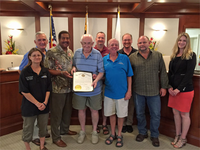 Councilman Cumbo, on behalf of the Maryland State Governor Larry Hogan, presents John Bacon with the Governor’s Citation in recognition of his service as President of the Chesapeake Beach Oyster Cultivation Society. (Left to Right) Councilwoman Valerie Beaudin, Councilman Lawrence Jaworski, Councilman Stewart Cumbo, Mr. John Bacon – President of the Chesapeake Beach Oyster Conservation Society, Councilman Derek Favret, Mayor Pat Mahoney, Councilman Keith Pardieck, Councilman Gregory Morris, and Town Administrator Holly Wahl.