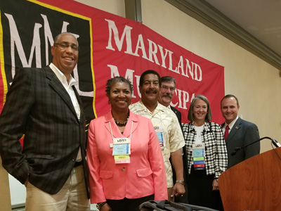 Councilman Cumbo, a member of the MML Legislative Committee, is attending the 2017 MML Legislative Conference in Rockville, Maryland. (From left to right) Greenbelt Mayor, Emmett Jordan, Cambridge Mayor Victoria Jackson-Stanley, Chesapeake Beach Councilman and past MML President Stewart Cumbo, New Market Councilman and current MML President Jake Lawrence Romanell, Rockville Mayor Bridget Newton, Gaithersburg Councilman and MML Legislative Committee Chair Ryan Spiegel.