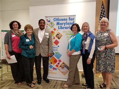 October 2017 - Supporting Citizens for Maryland Libraries at the statewide Trustees, Friends, and Foundation Conference in Laurel, Maryland: (From left to right) Sarah Avant, Executive Director Citizens for Maryland Libraries; Martha Grahame, President Board of Trustees Calvert Libraries; Stewart Cumbo, Board of Trustees Calvert Libraries; Carrie Plymire, Executive Director Calvert Libraries; Karen Eggert, Board of Trustees Calvert Libraries and President of SMRLA (Southern Maryland Regional Library Association); and Patricia Hoffman, Program Chair Citizens for Maryland Libraries.