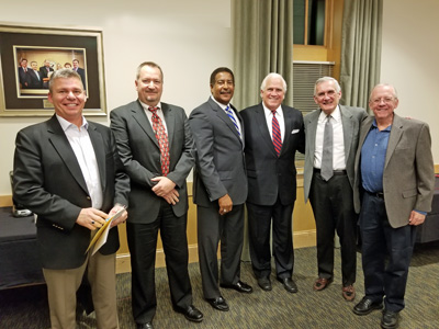 (From left to right) Bridget Newton, Mayor City of Rockville; David Harrington, former Maryland State Senator and MML Past President 2001-2002; Bruce Wahl, former Mayor Town of Chesapeake Beach, MML Past President 2014-2015; Lawrence “Jake” Romanell, Councilman, Town of New Market, MML President 2017-2018; Stewart Cumbo, Councilman Town of Chesapeake Beach, MML Past President 2007-2008; Tracy Grant, Mayor Town of Edmonston, MML Past President 2016-2017